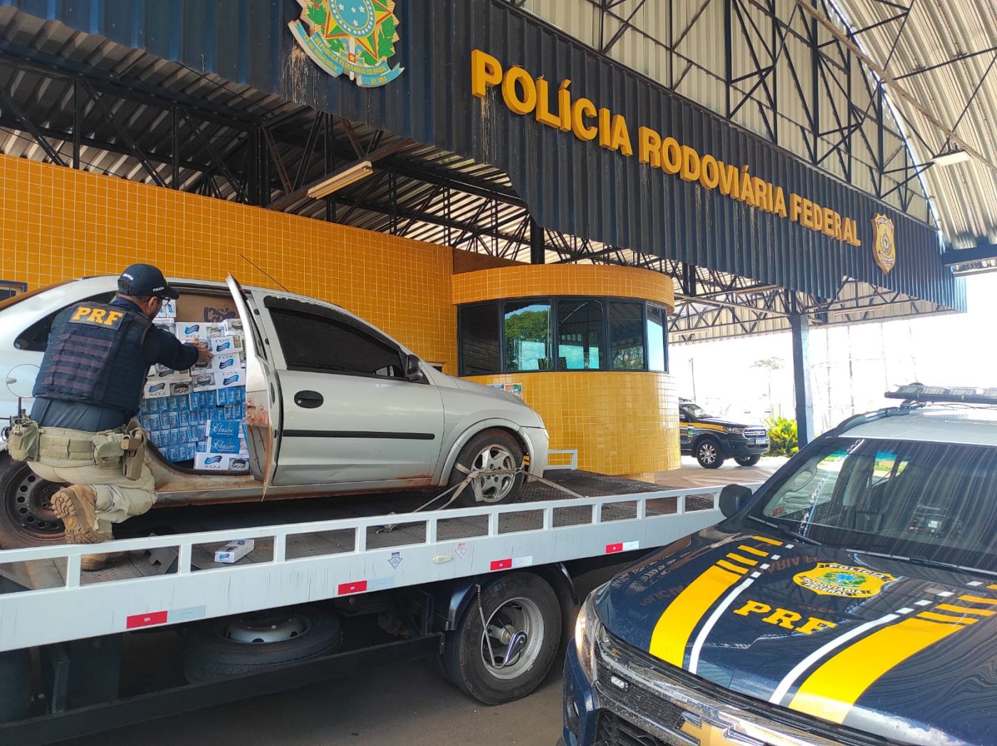 A Polícia Rodoviária Federal (PRF) apreendeu no início da tarde desta segunda-feira (1), na área rural de Guaíra (PR), um carro sedã carregado de cigarros contrabandeados.
