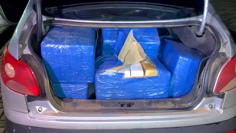 Durante a abordagem a um carro, os agentes encontraram 235,8 quilos de maconha e 360 maços de cigarro, totalizando sete caixas grandes do produto irregular. Todo o material estava escondido no veículo.