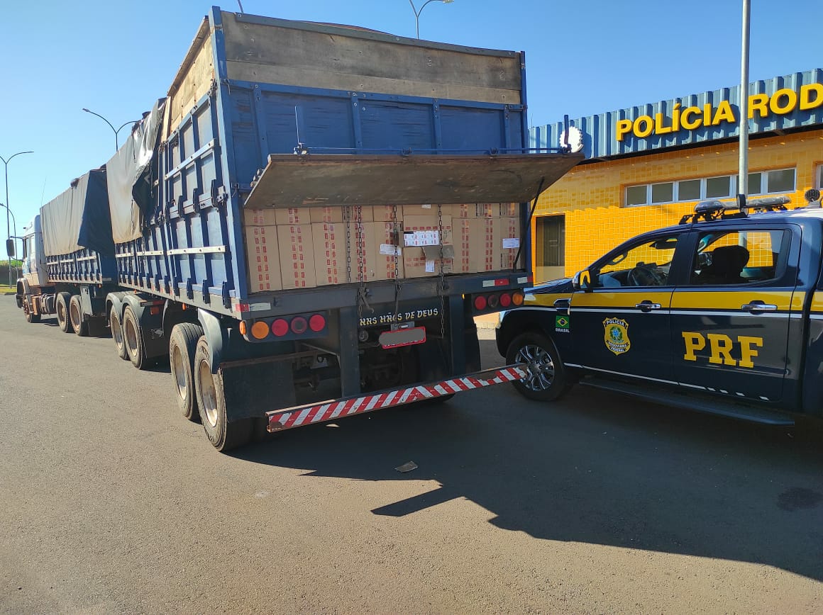 A Polícia Rodoviária Federal (PRF) apreendeu no início da manhã desta terça-feira (04), em Guaíra, cerca de 600 mil maços de cigarros contrabandeados do Paraguai que eram transportados por um homem em um bitrem com placas trocadas.