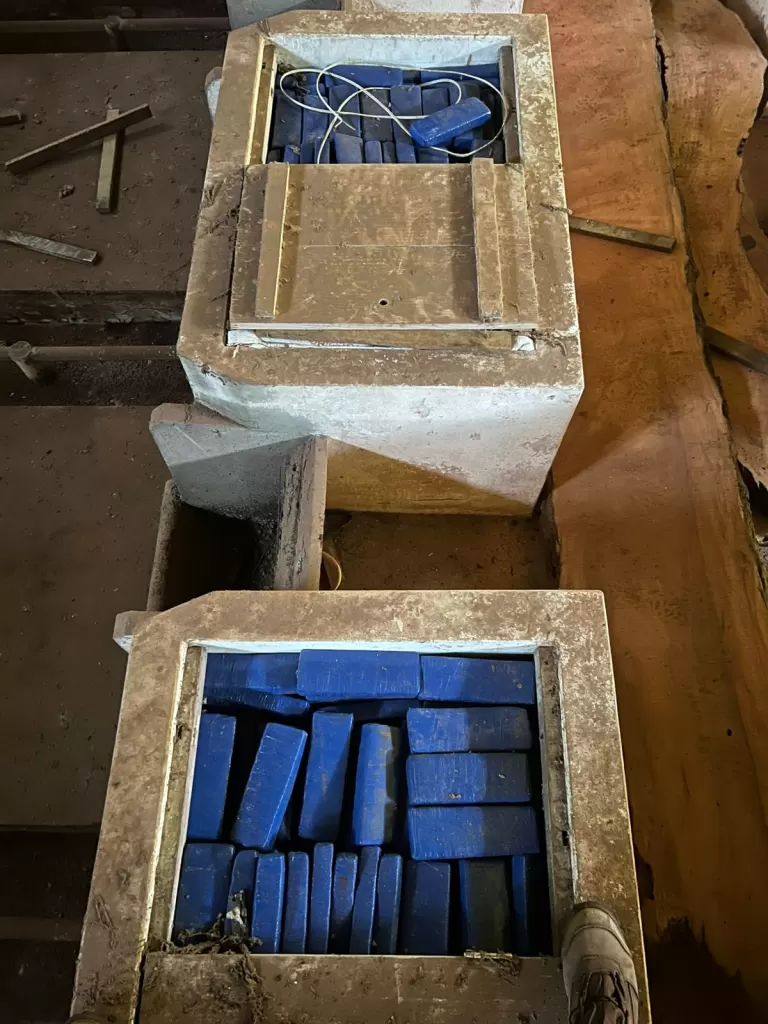 No local, as equipes policiais localizaram um depósito de cereais que ocultava um esconderijo subterrâneo. Ao acessarem o compartimento, os policiais encontraram 896 quilos de maconha, além de um arsenal e produtos de contrabando, como: