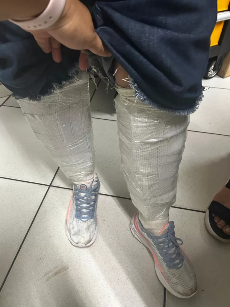 Nas imagens é possível ver que os eletrônicos estavam presos nas pernas e também na região da cintura. Eles foram presos com cinta, faixa e plástico para evitar que caíssem.