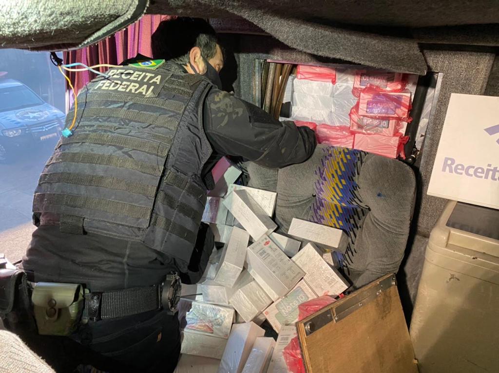Já no início da operação, um ônibus que tinha como destino Londrina (PR) foi abordado trazendo 370 celulares avaliados em cerca de R$ 363 mil em um fundo falso na parte traseira do veículo. O condutor e o guia do ônibus foram encaminhados à Polícia Federal e os passageiros, liberados.