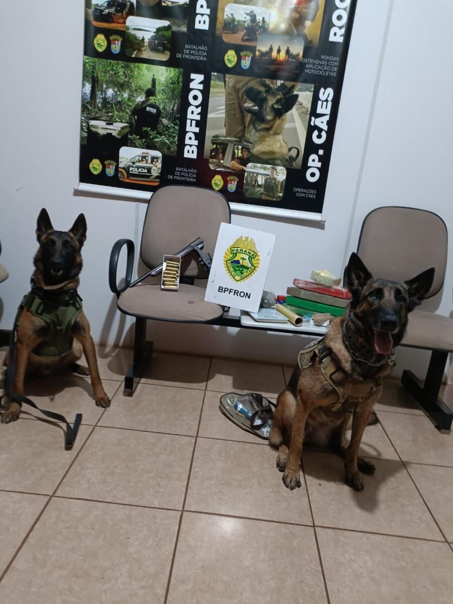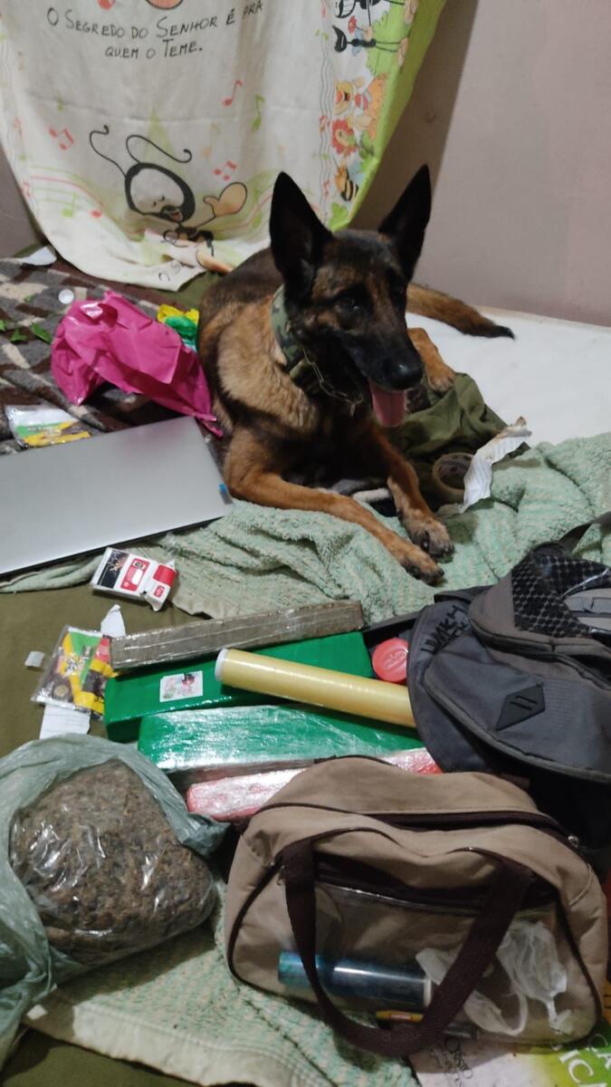 Os cães de faro do canil do BPFron encontraram duas mochilas contendo drogas, uma arma de fogo e munições na residência. Ao todo, foram apreendidos 3,280 quilos de maconha, 360 gramas de morruga, duas balanças de precisão, uma espingarda calibre 16 e 15 munições calibre 16.