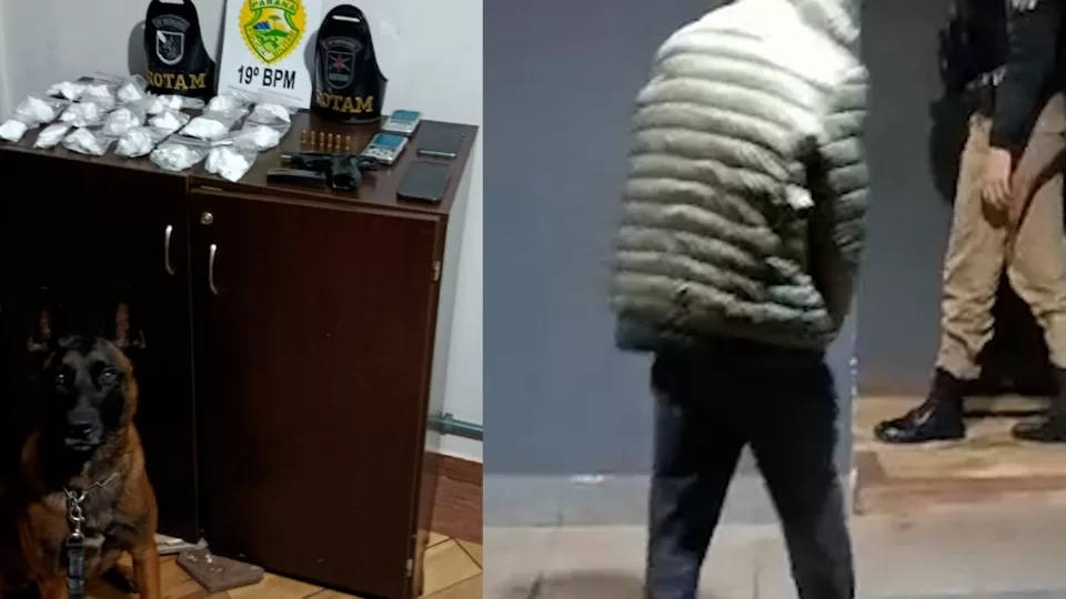 Durante a ação, os policiais identificaram um dos abordados como sendo um morador da região, conhecido pelo apelido de “Lampião”, apontado em denúncias por armazenar drogas em casa. A equipe seguiu até a residência, com apoio do canil da PM, e o cão farejador K9 Zeus indicou a presença de entorpecentes. Na casa foram localizadas grandes porções de cocaína escondidas em diversos cômodos, além de duas balanças de precisão, embalagens plásticas e uma pistola calibre 380 com seis munições intactas.