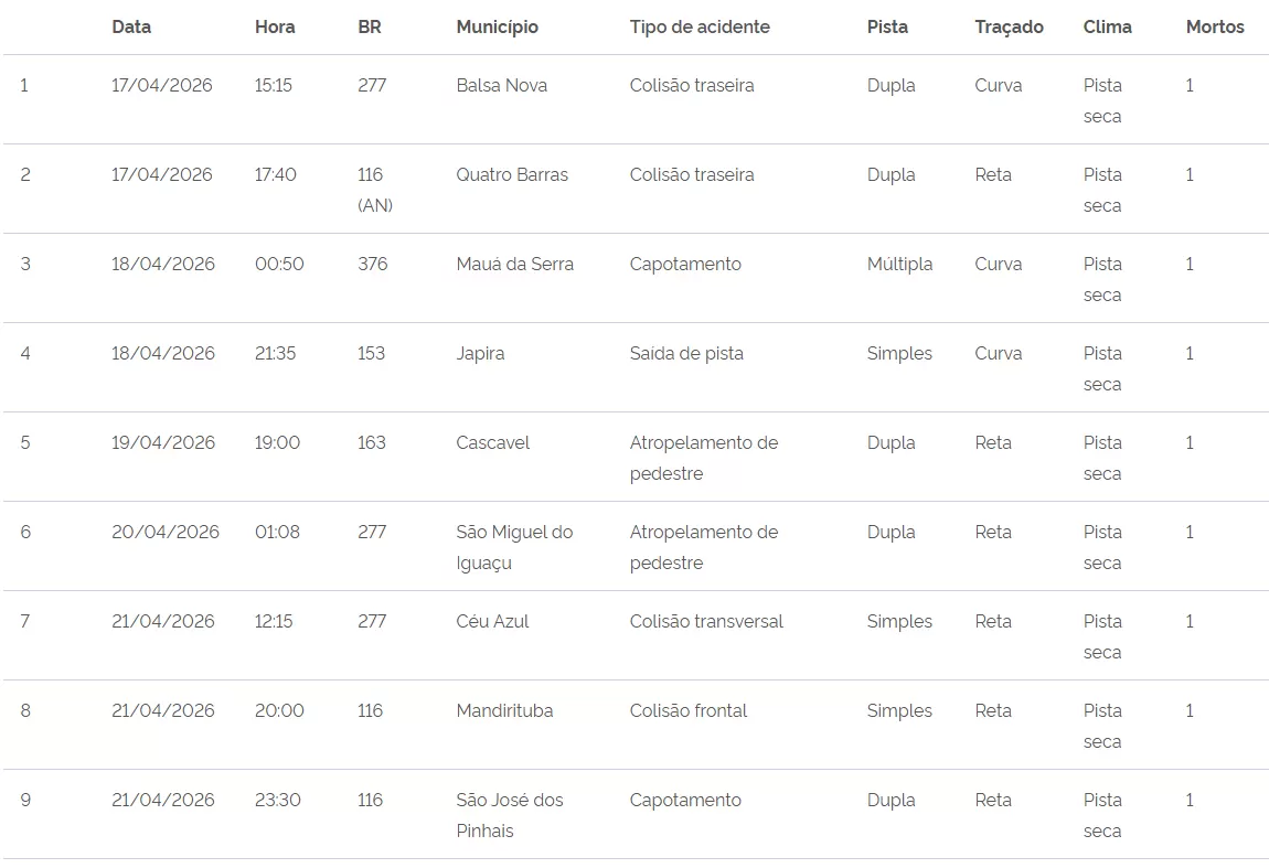 O acidente mais grave foi registrado na sexta, na BR-277, em Balsa Nova, em um engavetamento envolvendo nove veículos e que resultou na morte de uma pessoa.