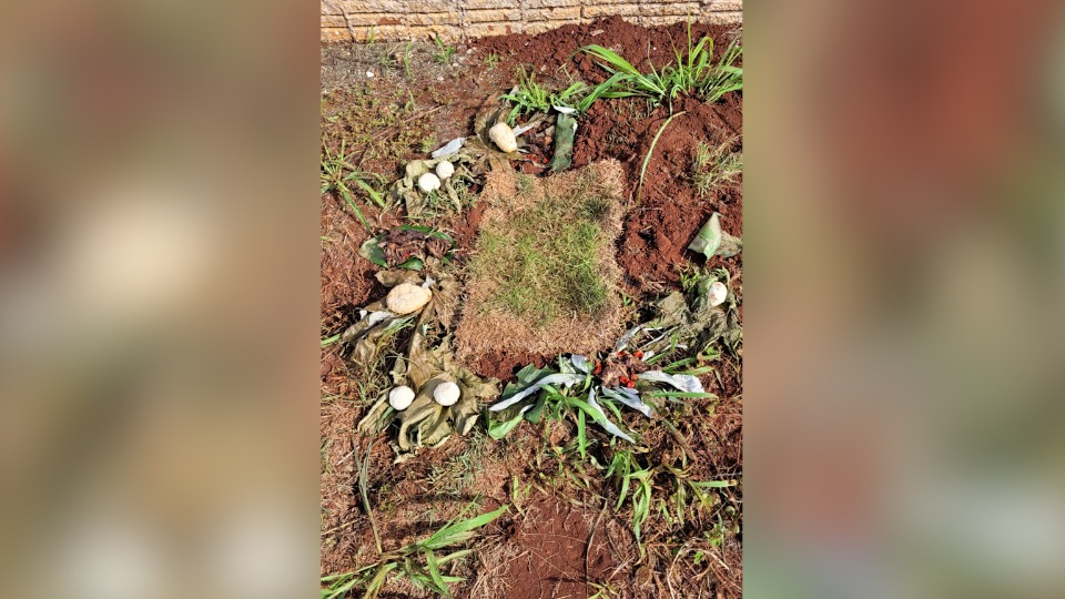 No segundo, outro ritual. Desta vez, um saco preto estava enterrado e rodeado de facas cravadas.