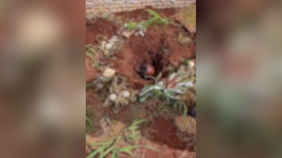 No primeiro vídeo é possível ver um homem desenterrando o local em que é cercado por pedras e folhas. Um crânio estava enterrado no centro das pedras.