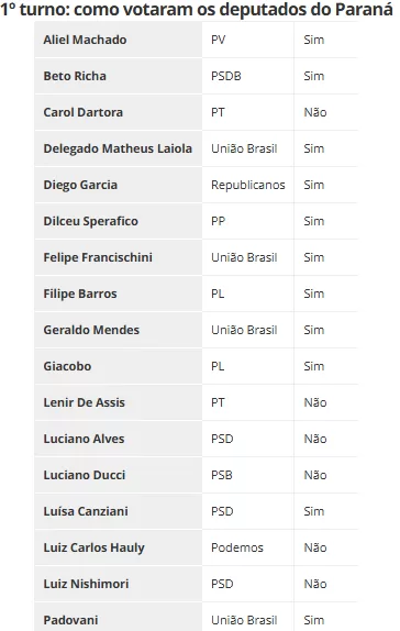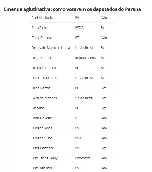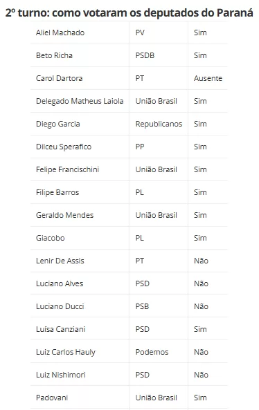 Os deputados paranaenses deram 21 votos “sim” nos dois turnos de discussão da PEC. No primeiro turno, o projeto teve oito votos “não” entre os representantes do estado, com um deputado ausente. No segundo turno, foram sete votos contrários e duas ausências.