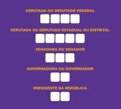 Neste ano, os eleitores irão primeiramente votar para deputado federal, que tem quatro dígitos. Depois, a votação deverá seguir como deputado estadual/distrital (cinco números), senador (três números), governador (dois números) e, por fim, presidente da República (também com dois dígitos).