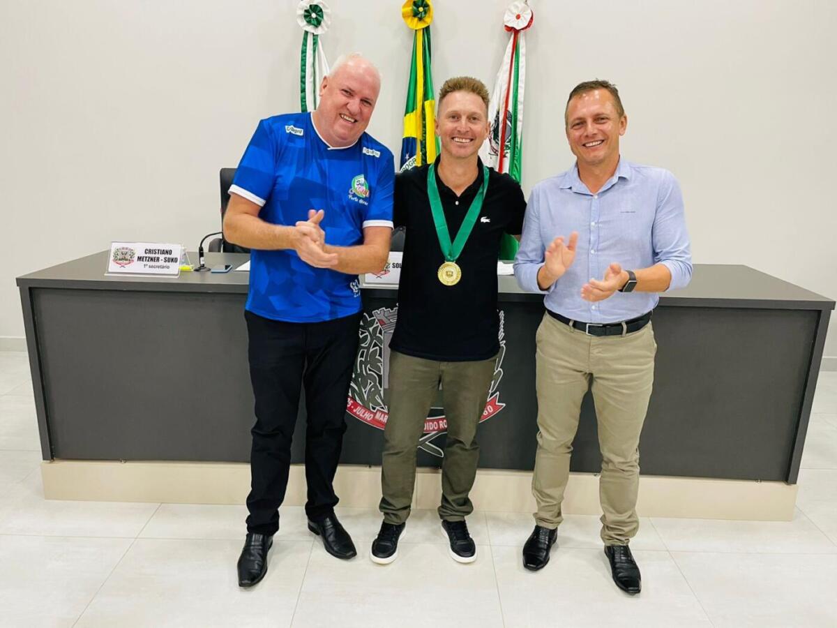 A Câmara de Vereadores de Marechal Cândido Rondon realizou nesta segunda-feira (18), durante a sessão ordinária, cerimônia para entrega de “Medalha de Honra ao Mérito” ao educador físico Ademir Biesdorf, em reconhecimento aos relevantes serviços prestados à comunidade do distrito de Porto Mendes, em especial através da Associação Saúde Nota 10.