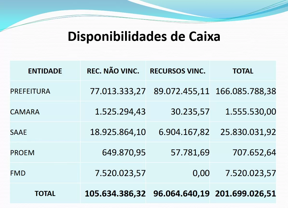 Contudo, o relatório indica que a situação financeira do município é boa, com disponibilidade de caixa de R$ 201 milhões. Destes, R$ 96 milhões são vinculados (tem aplicação definida) e R$ 105,6 milhões são recursos livres.