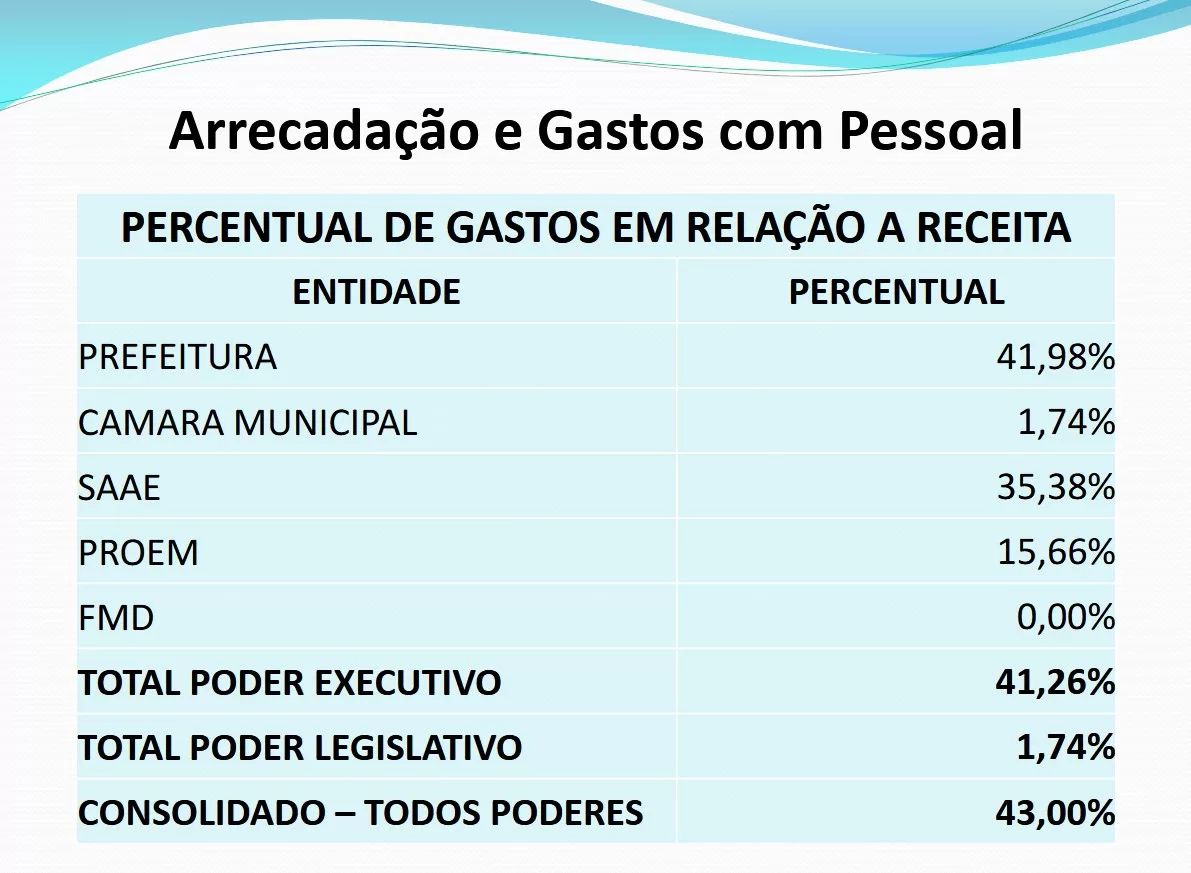 De janeiro a abril, a arrecadação da Prefeitura foi de R$ 140,6 milhões e as despesas empenhadas R$ 216 milhões. Os gatos com folha de pagamento de funcionários ficaram em 41,98%. Portanto, abaixo do limite máximo permitido pela Lei de Responsabilidade Fiscal, que é de 54% Receita Corrente Líquida.
