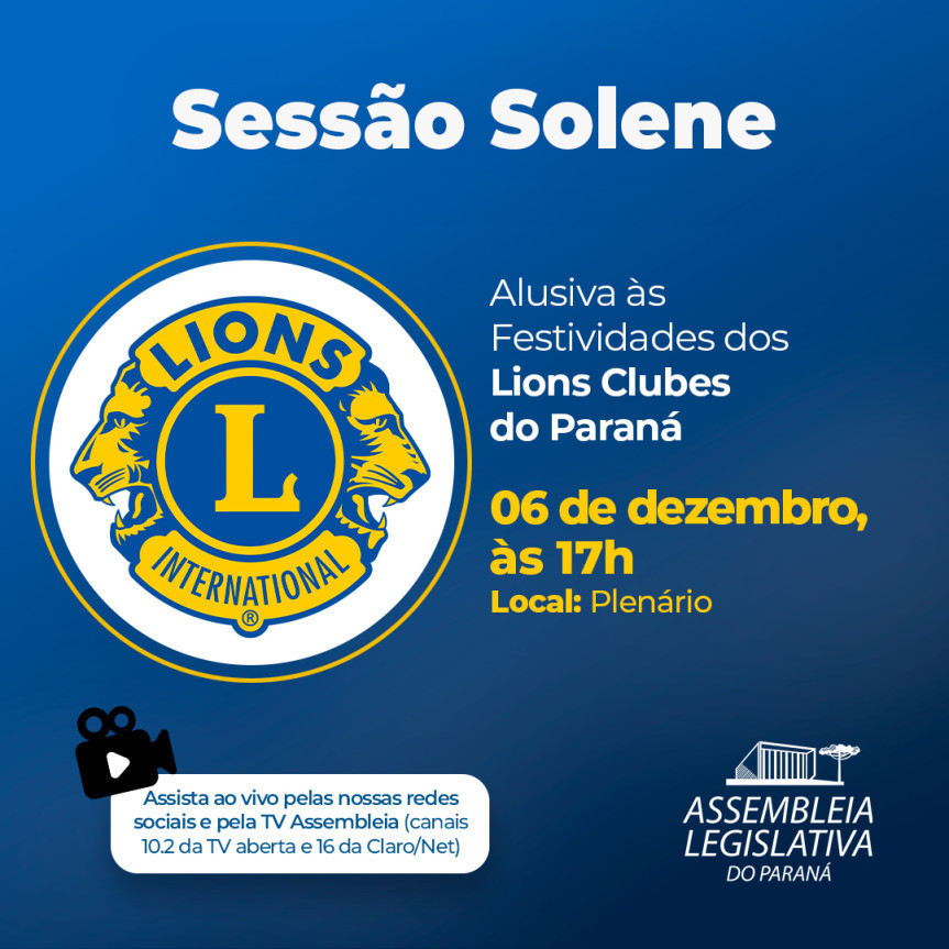 No dia seis de dezembro de 2024, às 17 horas, a Assembleia Legislativa do Paraná sediará uma Sessão Solene em comemoração às “Festividades dos Lions Clubes do Paraná”, por proposição do Deputado Pedro Paulo Bazana (PSD). O evento, que acontecerá no Plenário da Assembleia, prestará homenagens a Lions Clubes com mais de 50 anos de história, abrangendo 45 municípios do estado.
