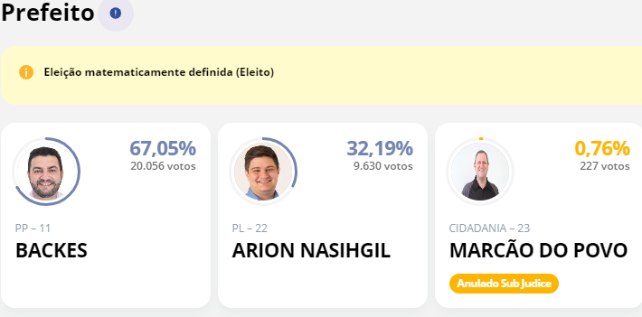 Backes e Sauer somaram 20.056 votos (67,05%). Os outros candidatos Arion Nasihgil/Claiton Schlindwein fizeram 9.630 votos (32,19%) e Marcão do Povo/Beto Pereira 227 votos (0,76%).