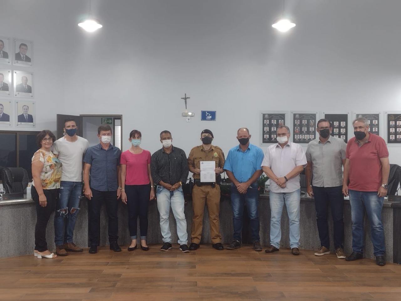 Na última segunda feira (13), na sessão ordinária a Câmara de Vereadores de Entre Rios do Oeste, em atendimento unânime a um requerimento, o Poder Legislativo concedeu uma Moção de Aplausos ao soldado Elton Melo Paulo, da Polícia Militar.