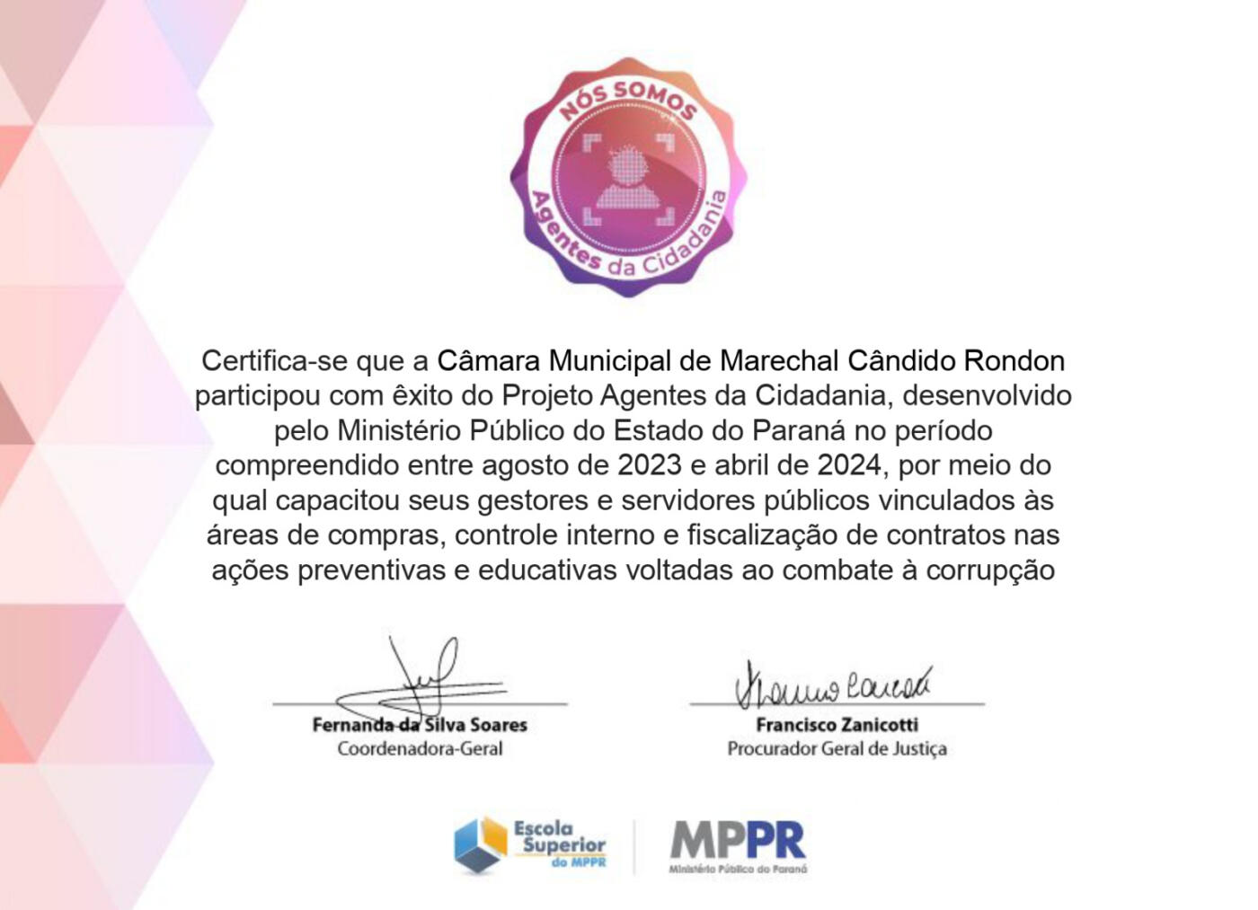 O Poder Legislativo de Marechal Cândido Rondon acaba de ser contemplado com o selo “Nós Somos Agentes da Cidadania”, conferido pelo Ministério Público do Paraná (MP-PR).