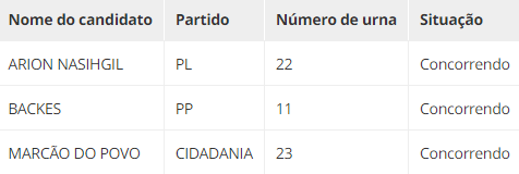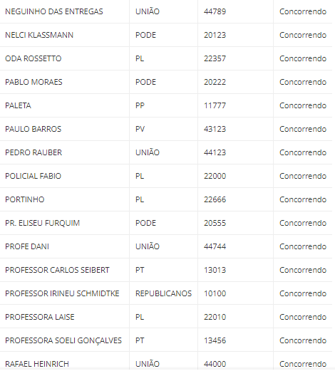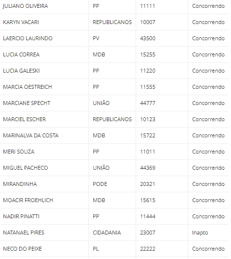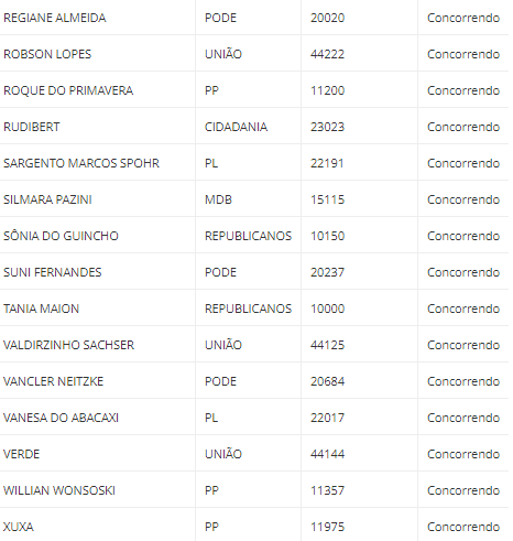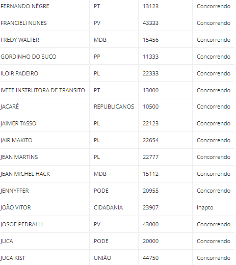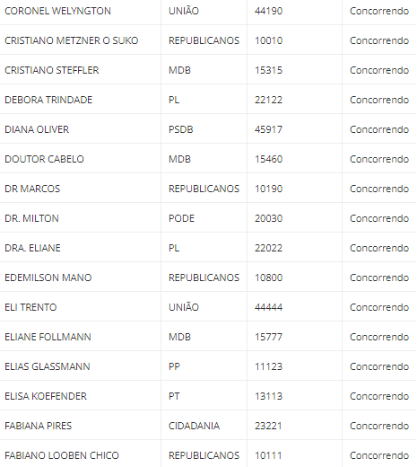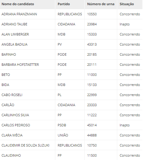 As listas de todos os candidatos estão disponíveis abaixo, com os nomes e os números de urna, os partidos e as situações de cada um (concorrendo ou inapto para concorrer). Para ver mais detalhes, (Clique aqui) e acesse a página do Quem eu escolho.