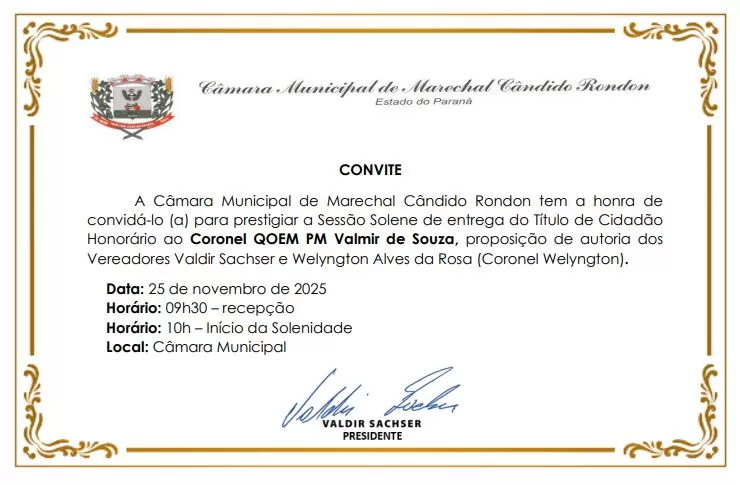 A Câmara Municipal de Marechal Cândido Rondon realiza na próxima terça-feira (25), com início às 10 horas da manhã, no plenário do Poder Legislativo, a solenidade de entrega do título de “Cidadão Honorário” ao coronel da Polícia Militar (PM), Valmir de Souza. A homenagem foi aprovada por meio do Projeto de Decreto-Legislativo 3/2025, de autoria dos vereadores Welyngton Alves da Rosa (Coronel Welyngton) e Valdir Sachser (Valdirzinho), presidente da Casa, em reconhecimento aos relevantes serviços prestados pelo oficial ao município.