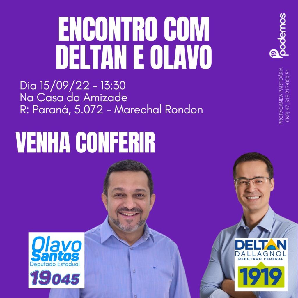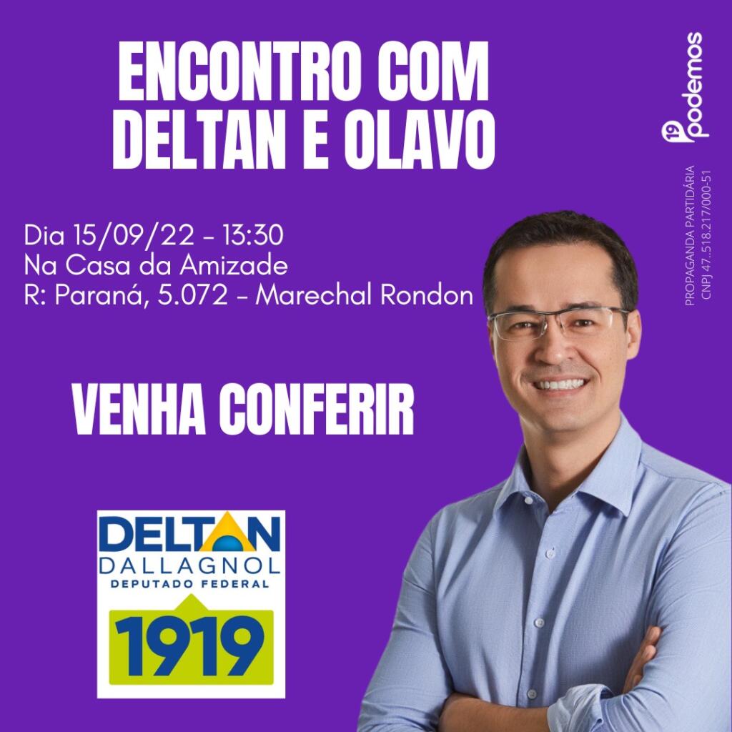 O candidato a deputado federal Deltan Dallagnol (Podemos) estará em Marechal Cândido Rondon na quinta-feira (15). Ele vai participar de um encontro a partir das 13h30, na Casa da Amizade, oportunidade em que vai expor a correligionários, lideranças, empresário, simpatizantes e a todos que comparecerem ao evento suas propostas de sua candidatura, que são baseadas em três pilares: justiça, prosperidade e cuidado com as pessoas. Também se fará presente o candidato a deputado estadual Olavo Santos (Podemos).