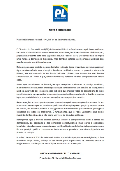 O Diretório do Partido Liberal (PL) de Marechal Cândido Rondon, assinado pelo presidente Arion Nasihgil, emitiu nota à sociedade, na noite desta quinta-feira (11), após o STF condenar o ex-presidente Jair Bolsonaro a 27 anos e três meses de prisão.