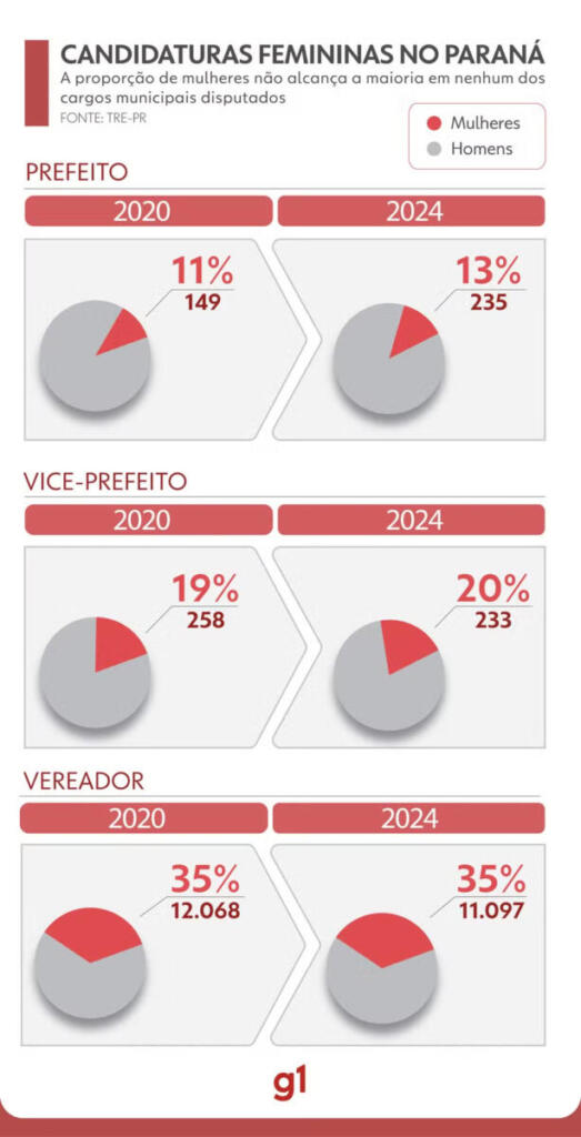 Em nenhum dos cargos disponíveis no estado, a representação na disputa passa de 35%. Situação semelhante ao Brasil, que apresentou 34% de candidatas mulheres em 2020 e 2024. Confira abaixo os dados do Paraná: