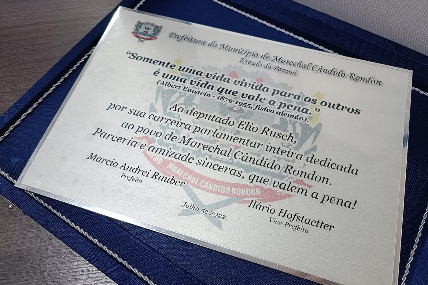Na placa entregue ao deputado Elio Rusch está grifado: “Somente uma vida vivida para os outros é uma vida que vale a pena (Albert Einstein)”.