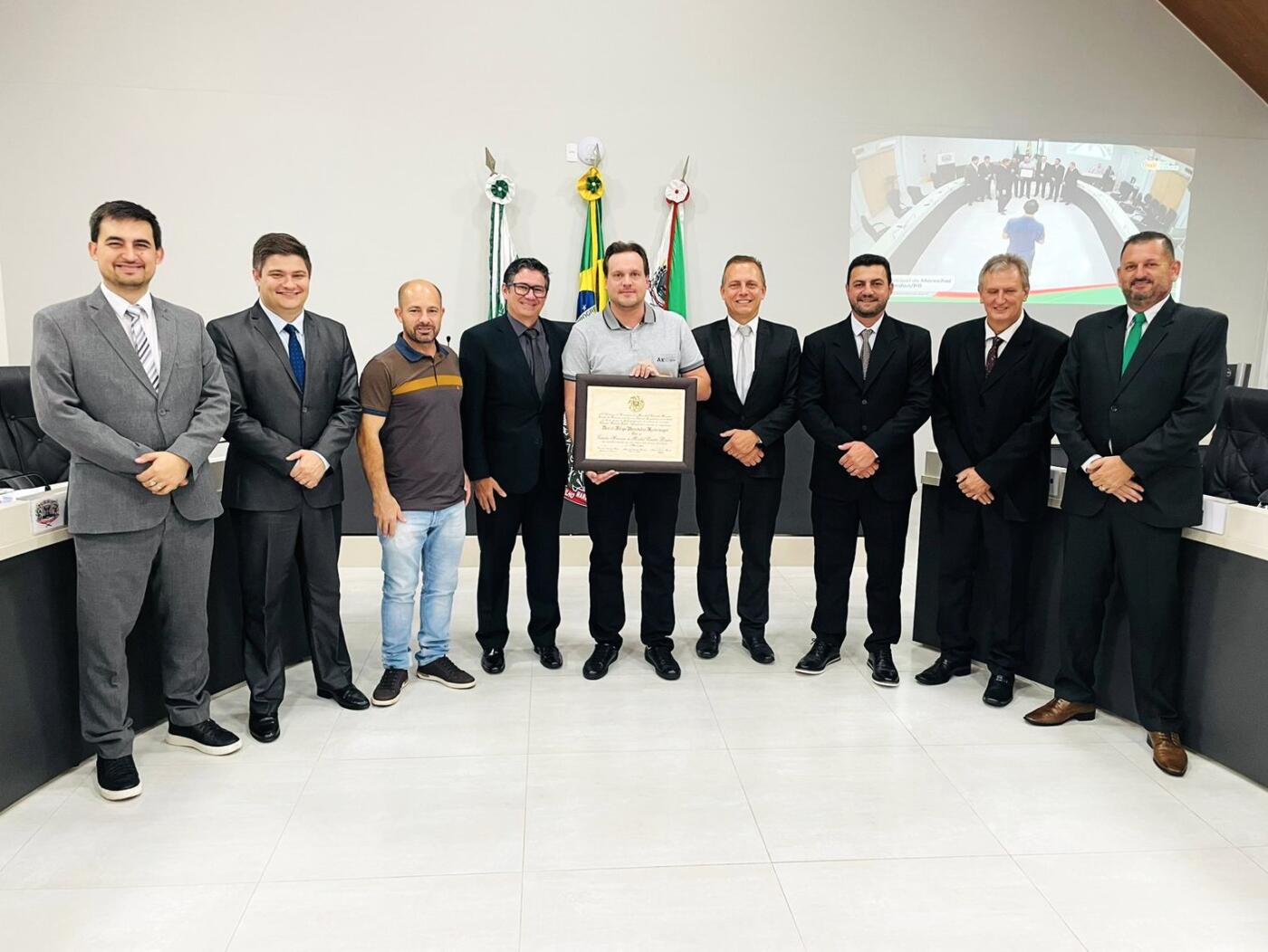 O autor da homenagem é o vereador licenciado e atual secretário municipal de Governo, Claudio Kohler (Claudinho). Na solenidade, ele também representou o prefeito Marcio Rauber.