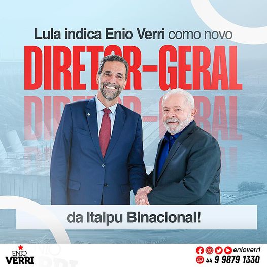 O deputado federal Enio Verri (PT) será o novo diretor-geral da Itaipu Binacional. O martelo foi batido durante reunião na tarde desta quinta-feira (26) entre o presidente Luiz Inácio Lula da Silva (PT), a presidente nacional do PT, Gleisi Hoffmann, e o deputado.