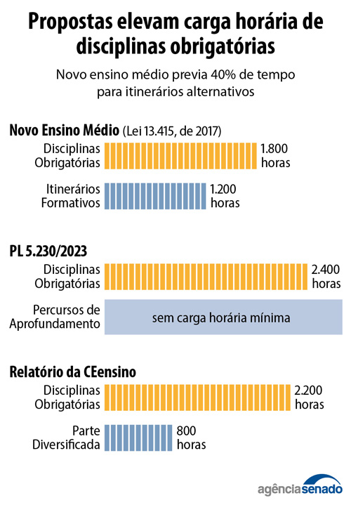 O projeto do Executivo recompõe as 2,4 mil horas anuais para as disciplinas obrigatórias e sem integração com curso técnico. No caso dos cursos técnicos, serão 2,1 mil horas de disciplinas básicas e pelo menos 800 horas de aulas técnicas. As regras que haviam sido estipuladas pelo NEM determinam que as escolas devem destinar 1,8 mil horas anuais para as disciplinas obrigatórias e o restante, de 1,2 mil horas, para os itinerários formativos: matemáticas; linguagens; ciências da natureza; ciências humanas; ou formação técnica e profissional.