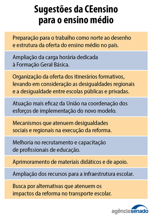 A necessidade de levar em conta a realidade de alunos e municípios foi apontada na quinta audiência da comissão, também em junho. Em julho, o sexto debate promovido pela Ceensino trouxe representantes do Sistema S e de instituições de ensino para tratar da educação profissionalizante. O debate seguinte, também em julho, teve como uma das conclusões necessidade de garantir a permanência na escola, especialmente para alunos que precisam trabalhar.