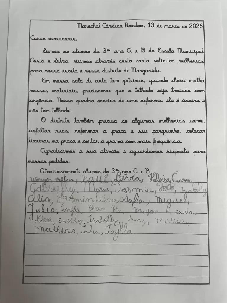 Os professores e estudantes entregaram ofício solicitando melhorias na escola, entre elas a reforma do telhado e revitalização da quadra de esportes, incluindo construção de cobertura deste espaço. Ainda foram apresentadas demandas ao distrito, como pavimentação de ruas e reforma completa da praça.