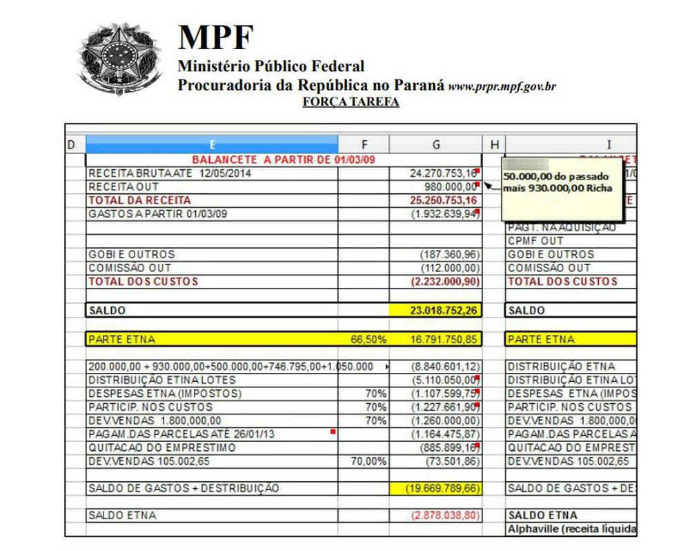 O empresário apresentou aos investigadores uma planilha criada na época da transação, que mostra os valores envolvidos no negócio.