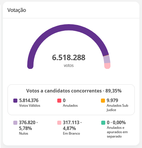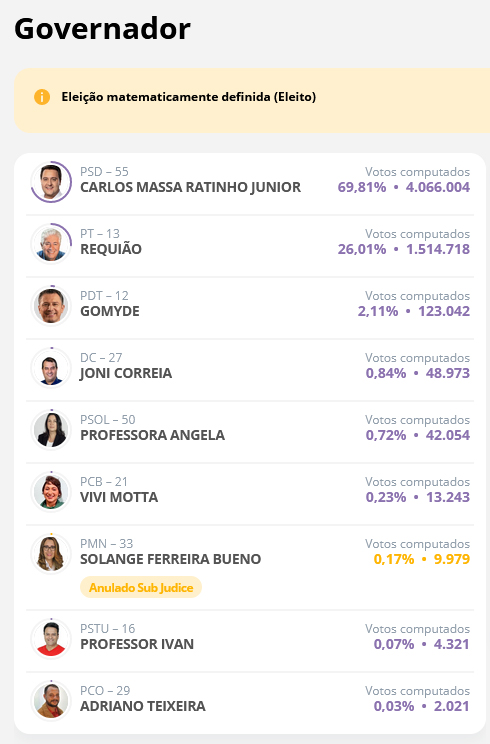 Antes mesmo do total de contabilização do votos, ainda com 80% da apuração no Paraná, o governador Ratinho Junior (PSD) já foi matematicamente eleito para mais um mandato. Ele garantiu o segundo mandato com 69,8% dos votos válidos, conforme 95% das urnas apuradas, enquanto o segundo colocado Roberto Requião (PT) alcançou 26%.