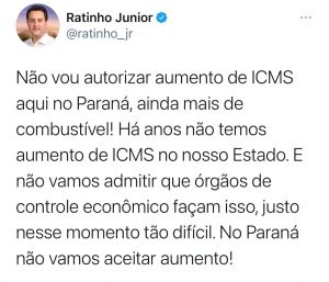 “Não vou autorizar aumento de ICMS aqui no Paraná, ainda mais de combustível! Há anos não temos aumento de ICMS no nosso Estado. E não vamos admitir que órgãos de controle econômico façam isso, justo nesse momento tão difícil. No Paraná não vamos aceitar aumento”, manifestou o governador pelas redes sociais.