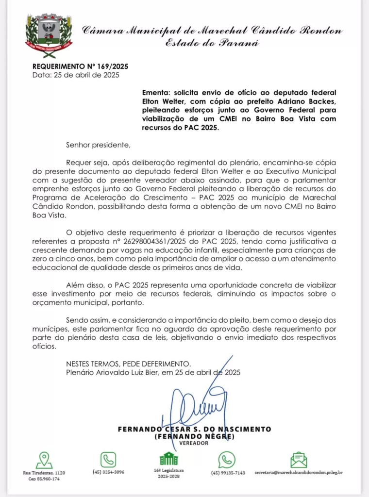 Vale destacar que, no mês de abril, foi aprovado na sessão legislativa o Requerimento nº 169 de 2025, de autoria do vereador Fernando Nègre, que pleiteou esforços junto ao Governo Federal, por meio do deputado federal Elton Welter, para viabilizar a construção de um novo Centro Municipal de Educação Infantil – CMEI, essa solicitação foi reforçada pelo vereador Fernando Nègre durante a visita a capital federal no mês de maio.