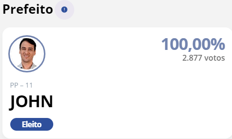 John, do Progressistas, foi eleito no domingo (6) prefeito de Pato Bragado para os próximos quatro anos. Ao fim da apuração, John teve 2.877 votos. Ele era o único candidato.