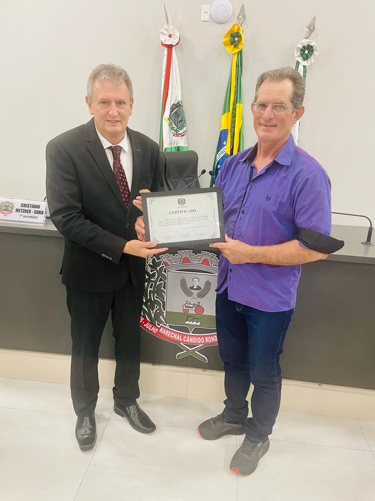 A Câmara de Vereadores de Marechal Cândido Rondon entregou, na sessão de segunda-feira (9), certificado de “Menção Honrosa” a Leonildo Baltassar, em reconhecimento à dedicação voluntária ao esporte local, em especial ao futsal feminino, no qual conquistou diversos títulos como técnico.