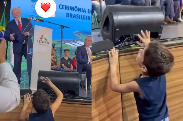 O petista cumprimentava várias autoridades que estavam presentes no local, quando uma criança se aproximou do palco e chamou a atenção do presidente: “Oi, Lula”, disse duas vezes. Nesse momento, Lula para, e olha para o menino, e retribui o cumprimento.