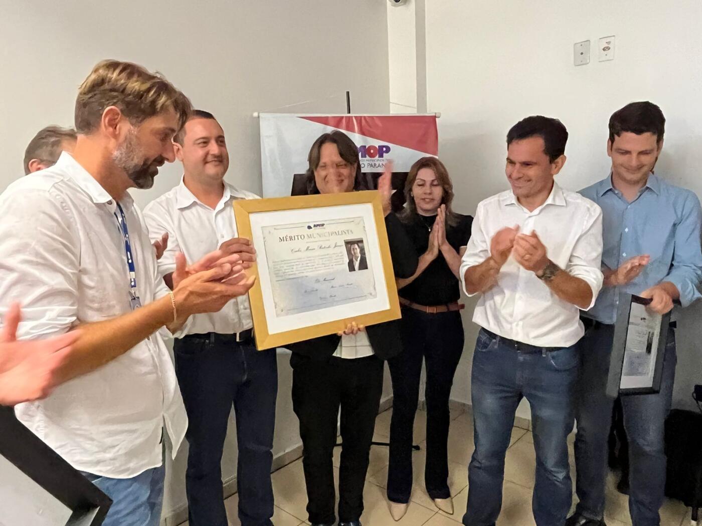 Os prefeitos e as prefeitas da Amop homenagearam o governador Ratinho Junior com o mérito municipalista, reconhecendo sua atuação sempre próxima dos Municípios. Os Secretários Marcelo Rangel e Eduardo Pimentel também foram homenageados pela entidade.