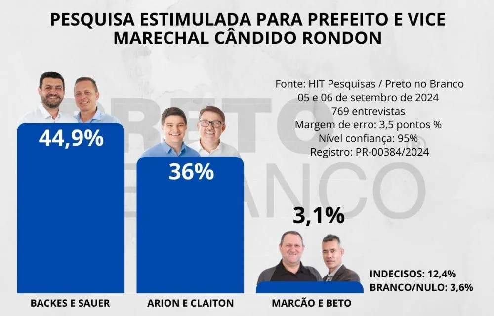 Contratado pelo jornal Preto no Branco, o HIT Instituto de Pesquisas e Estatísticas ouviu 769 eleitores de Marechal Cândido Rondon nos dias 5 e 6 de setembro de 2024. O nível de confiança da pesquisa é de 95% e a margem de erro é de 3,5%, para mais ou para menos. A pesquisa foi devidamente registrada perante o Tribunal Superior Eleitoral sob o nº PR-00384/2024.