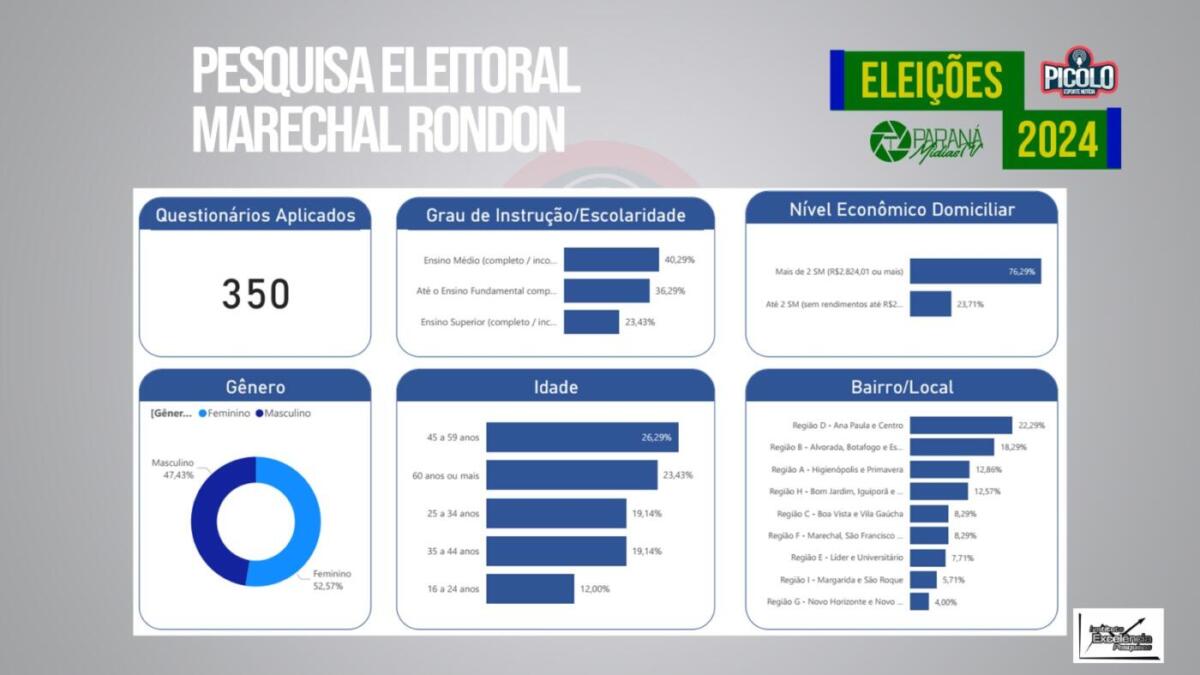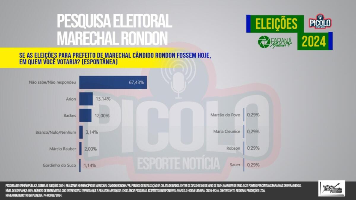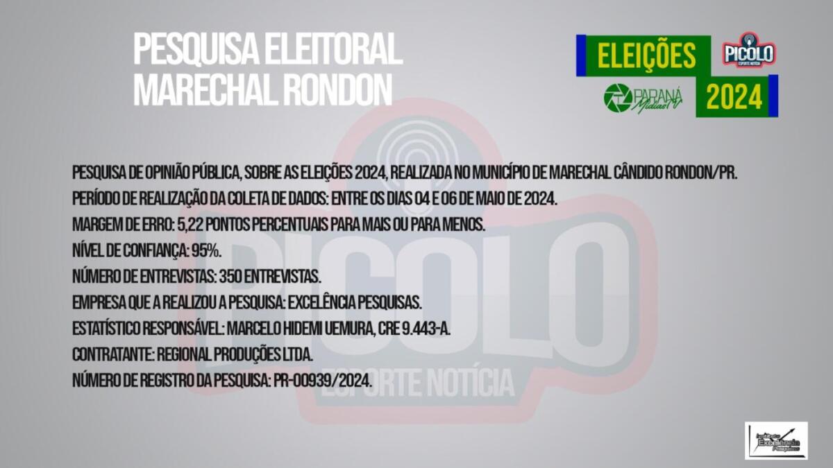 O Picolo Esporte Notícia divugou no programa desta sexta-feira (10) o resultado de uma pesquisa de opinião pública sobre as eleições 2024 realizada no município de Marechal Cândido Rondon.