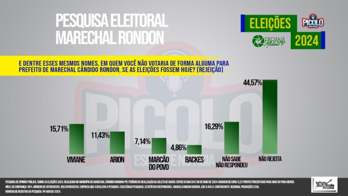 Na pesquisa que mediu a rejeição dos pré-candidatos a prefeito, ao responder a pergunta “Em quem você não votaria de forma alguma para prefeito de Marechal Cândido Rondon, se as eleições fossem hoje”, o resultado das respostas dos entrevistados mostrou a pré-candidata a prefeita do PSOL, a Viviane, liderando os números, com 15,71%. Na sequência aparece Arion, com 11,43%, Marcão do Povo, com 7,14%, e Backes, com 4,86%.