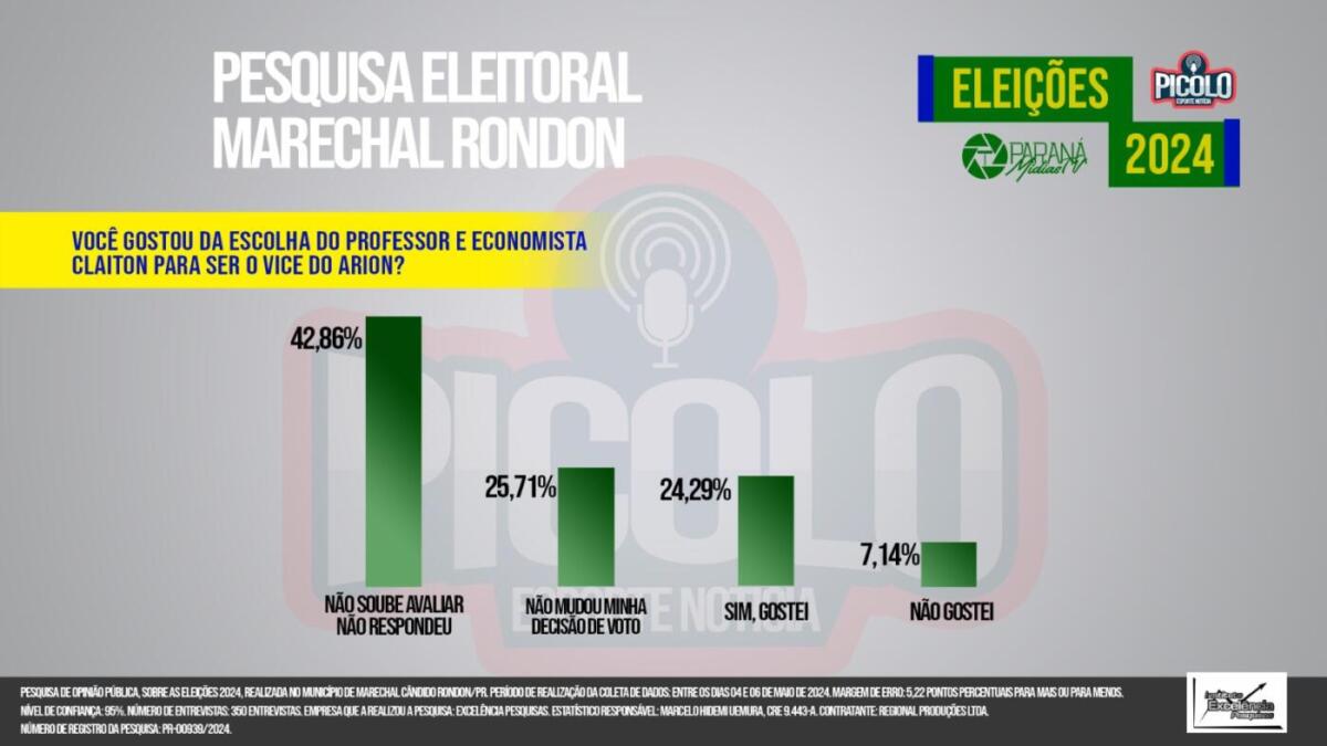 Quando a pergunta feita aos entrevistados foi “Você gostou da escolha do professor e economista Claiton para ser vice do Arion”, os números foram os seguintes (veja abaixo):