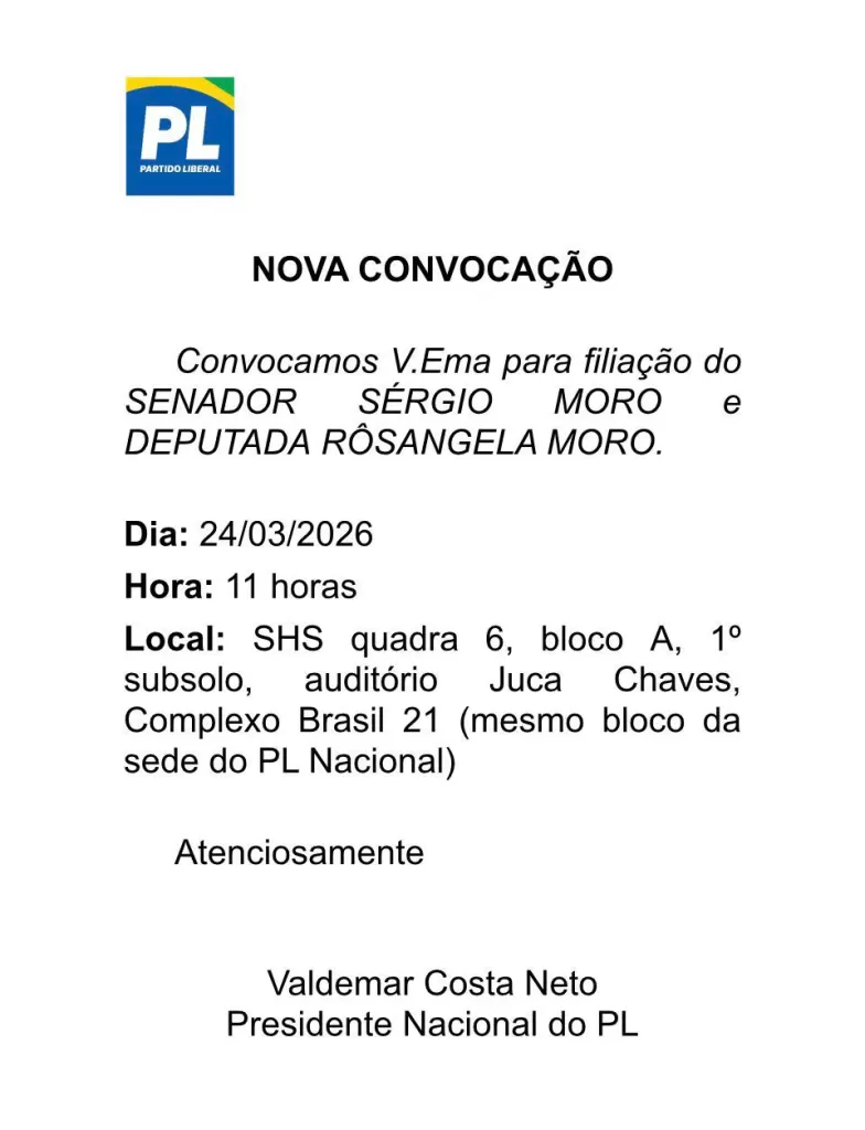 O convite para o evento é assinado pelo presidente nacional do PL, Valdemar Costa Neto. A expectativa é de que a solenidade reúna lideranças políticas, parlamentares e convidados, consolidando um movimento considerado relevante no cenário político nacional.