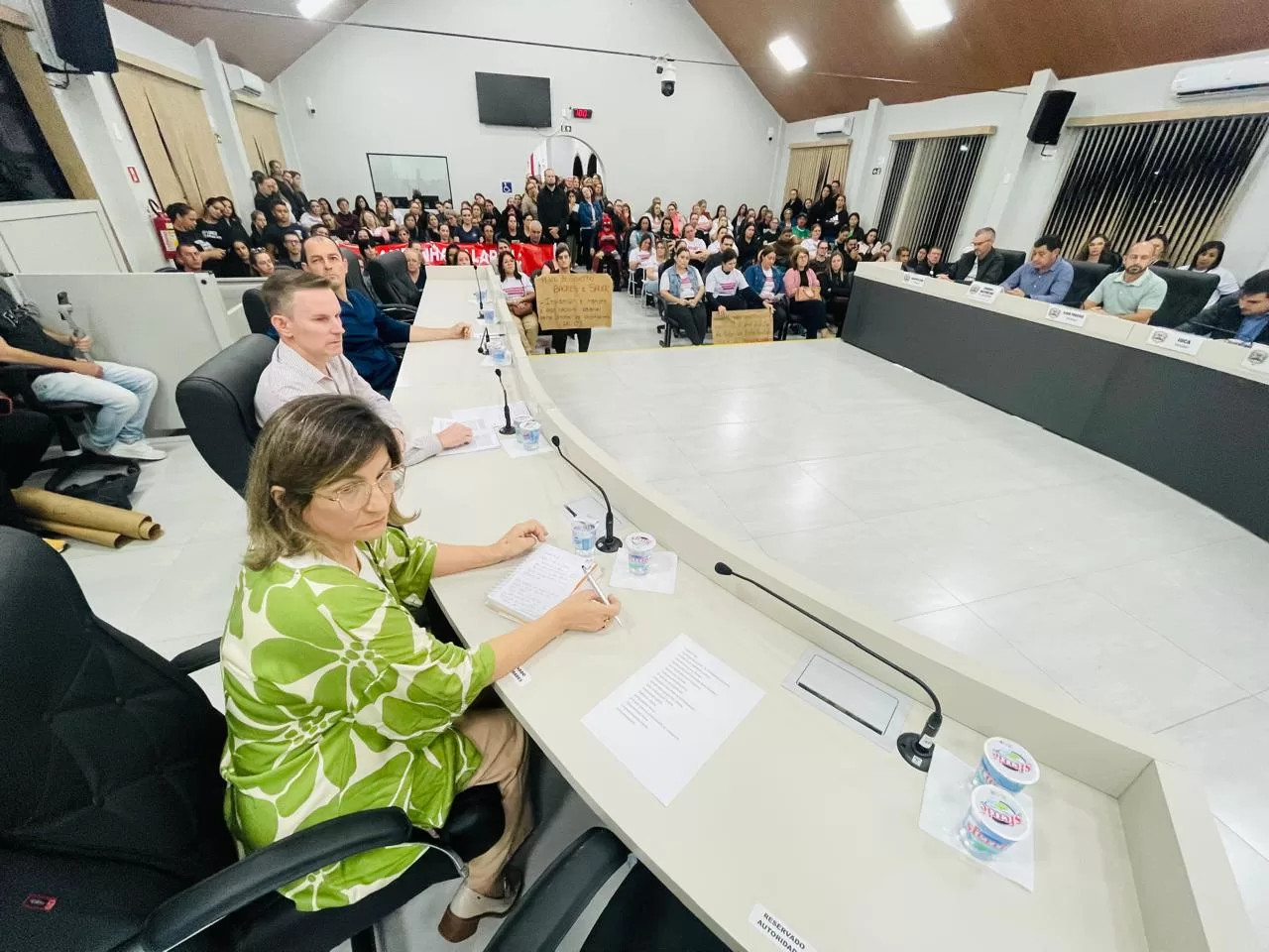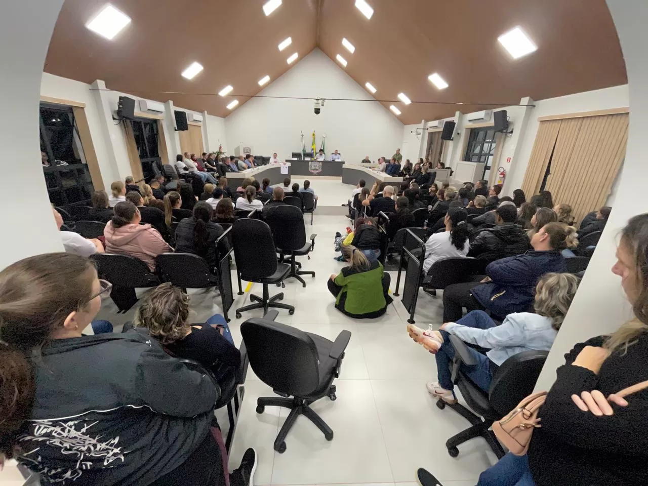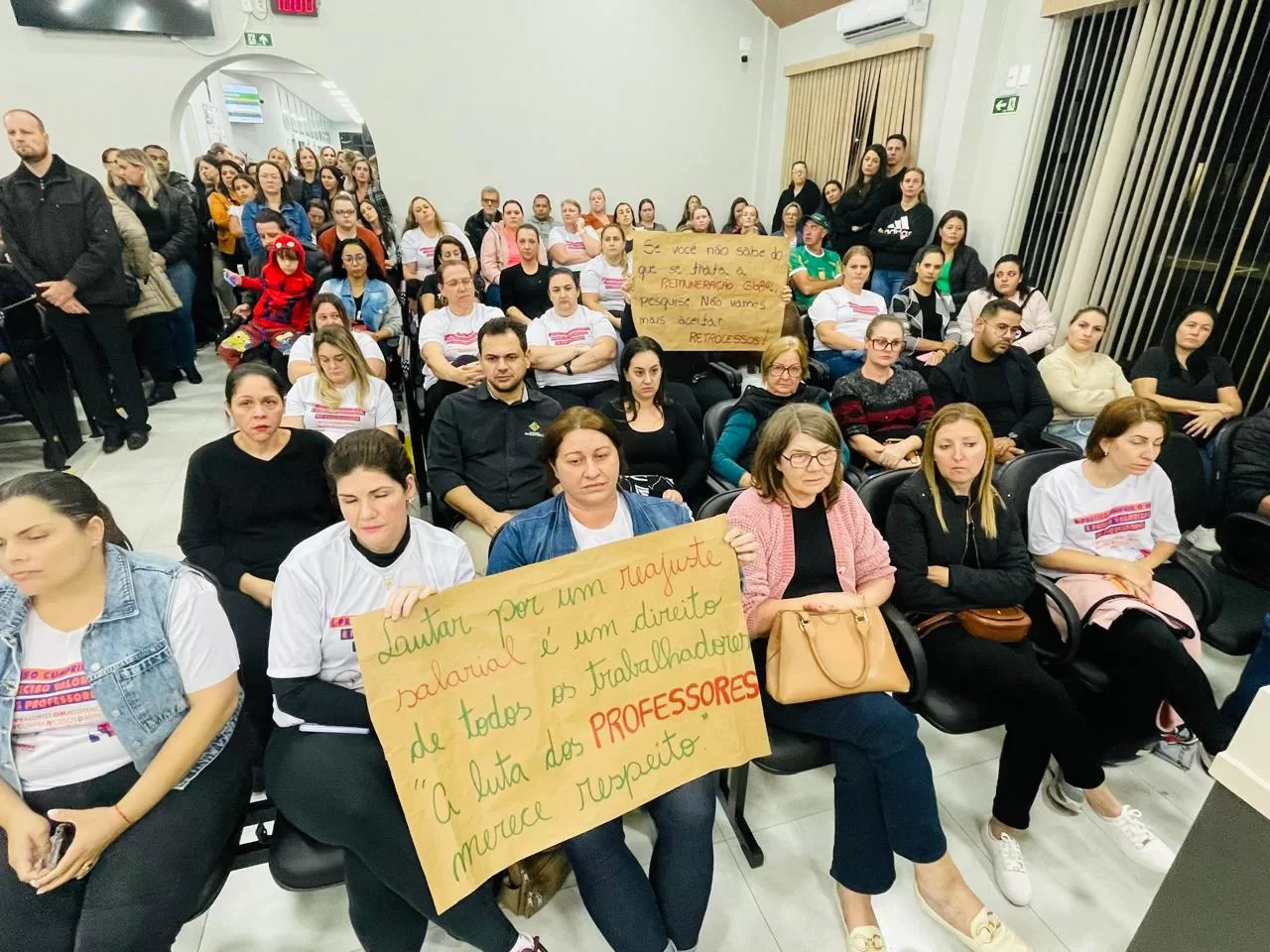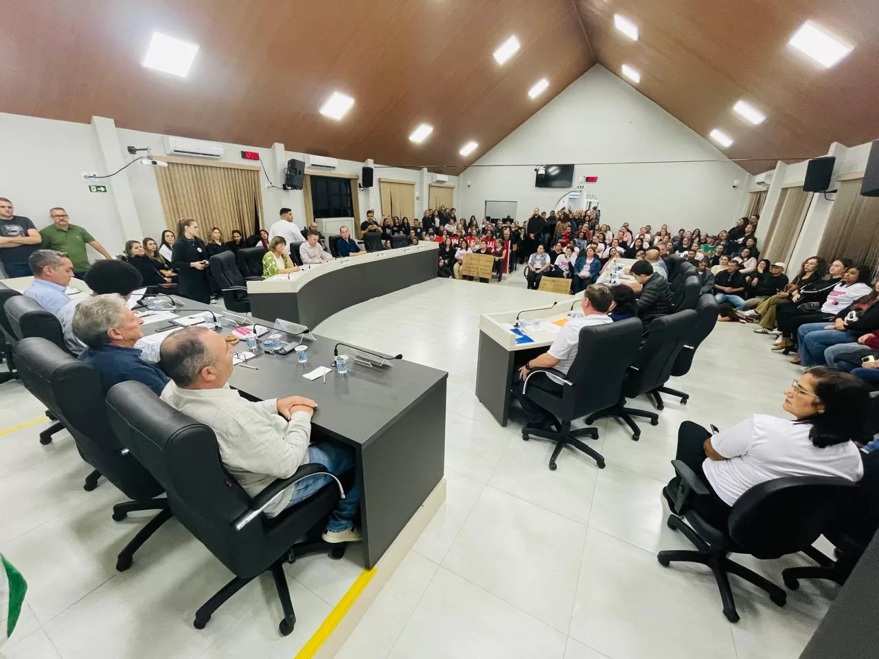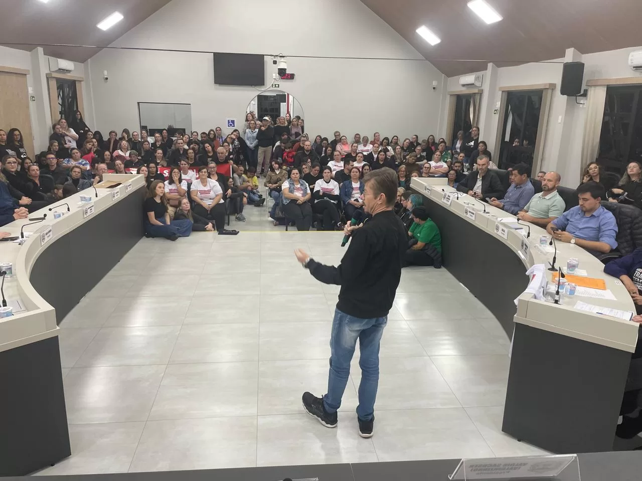 Com o plenário lotado, outras dezenas de pessoas assistindo pelo telão na área externa da Câmara de Vereadores e com picos de mais de 200 internautas acompanhando a transmissão ao vivo pela internet, o Poder Legislativo de Marechal Cândido Rondon debateu, na noite desta terça-feira (29), o reajuste do piso salarial dos professores que atuam nas escolas mantidas pela Prefeitura.