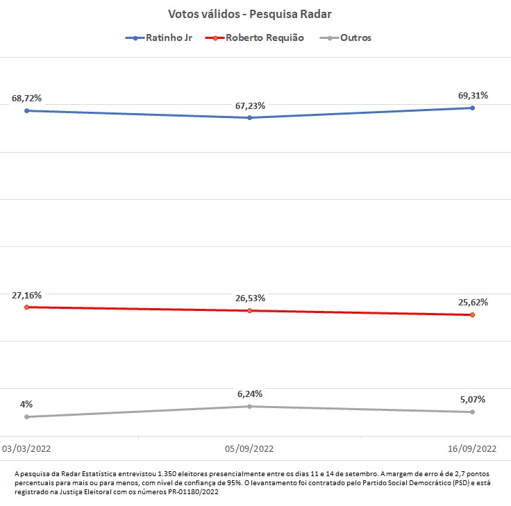 A pesquisa da Radar Estatística entrevistou 1.350 eleitores presencialmente entre os dias 11 e 14 de setembro. A margem de erro é de 2,7 pontos percentuais para mais ou para menos, com nível de confiança de 95%. O levantamento foi contratado pelo Partido Social Democrático (PSD) e está registrado na Justiça Eleitoral com os números PR-01180/2022 e BR-02453/2022.