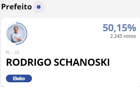 Rodrigo Schanoski (PL): 2.245 votos, 50,15% dos votos válidos