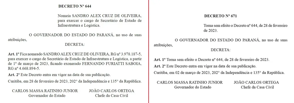 Sandro Alex foi confirmado chefe da pasta em 27 de fevereiro e o decreto de nomeação foi publicado no dia seguinte em Diário Oficial. Porém, no dia 2 de março, outro decreto anulou a nomeação.