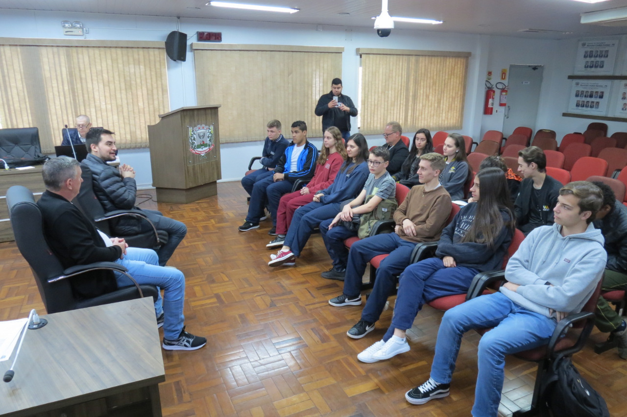 Na manhã de hoje (05), os 13 vereadores jovens participaram de reunião no Poder Legislativo. Os vereadores João Eduardo dos Santos (Juca) – idealizador da Câmara Jovem – e Valdecir Schons (Paleta) passaram informações sobre a posse e eleição da mesa diretora, além de como deverá ser o andamento dos trabalhos.