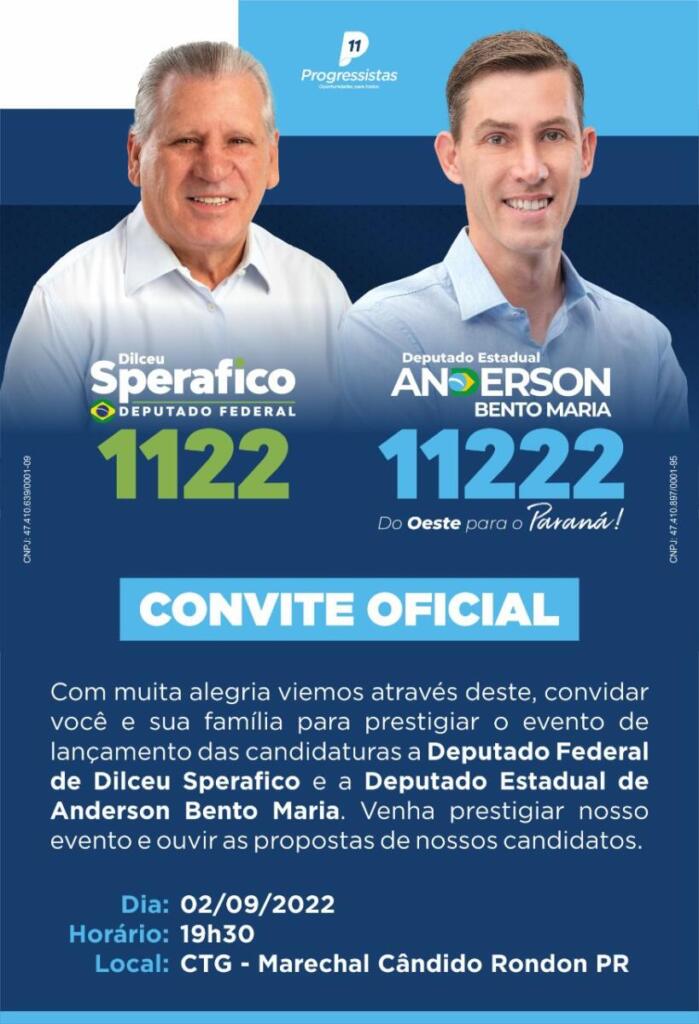 Está agendado para sexta-feira (02), nas dependências do Centro de Tradições Gaúchas (CTG) de Marechal Cândido Rondon, um evento de lançamento das candidaturas a deputado federal de Dilceu Sperafico e a deputado estadual de Anderson Bento Maria, ambos do partido Progressistas.